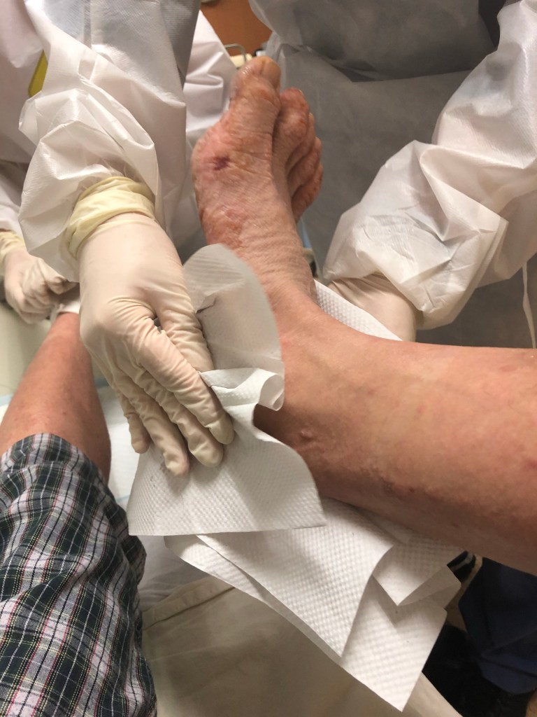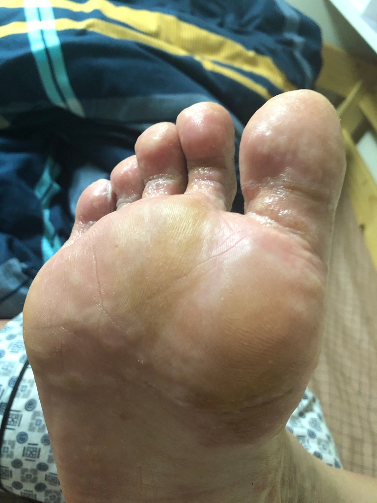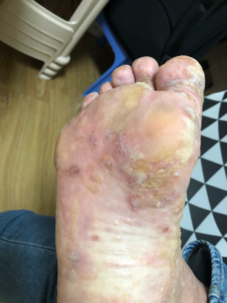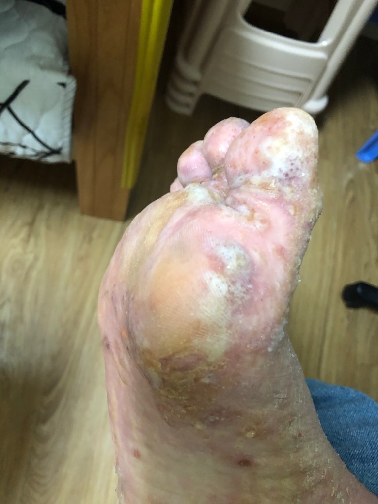 之後就係大家最期待嘅入廠之旅,究竟發生咩事搞到要咁嚴重入急症室呢?仲要一住就住左幾日呢?因為我隻腳開始不斷發炎,而且係食藥都撳唔住嗰種狀態,真係誇張到可以成隻腳爛晒咁樣,好多好多嘅水泡不斷流膿。咁起初都只不過係好似有啲汗皰疹咁樣狀況,有一啲小水泡生咗喺隻腳度,我有生汗皰疹的經驗,之前係生喺隻手度,所以一開始冇乜為意,覺得過一排就會自己好返,但之後過左一段時間就唔知點解啲小水泡開始合體變做大水泡。咁問題就嚟喇,佢哋係永無止境咁生晒喺我成隻腳度,咁我不斷將佢發炎嗰啲濃唧出嚟(其他人千祈唔好好似我咁),我就開發覺個問題好似嚴重到自己處理唔到,開始驚,真係未試過咁嚴重的程度。仲要啲膿係有味,瞓覺嗰時成張床都係,第二朝張被會濕晒咁。因為我自己處理極都唔好,仲好似越嚟越嚴重,屋企人我覺得我個情況真係唔係咁簡單,驚我遲啲會行唔到,就叫我去急症室睇。嗰陣時,我係誇張到出街成隻襪係好似濕咗水咁樣。